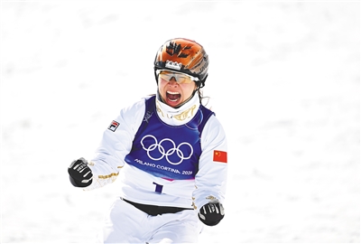 当地时间2月18日,在米兰-科尔蒂纳冬奥会自由式滑雪女子空中技巧决赛中,中国选手徐梦桃获得冠军。图为徐梦桃在决赛中庆祝。本栏图片均由新华社发