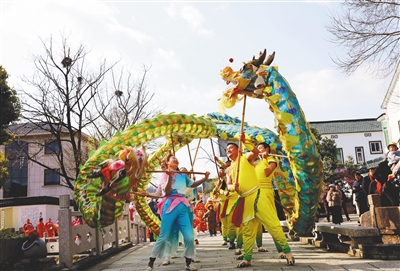 ④ 在浙江省湖州市长兴县李家巷镇石泉村,村民进行舞龙表演。