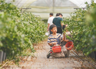 2月20日,在琼中黎族苗族自治县红毛镇什寒村的蓝莓基地,游客采摘蓝莓。