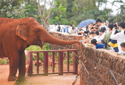 2月19日,海南热带野生动植物园迎来春节假期客流高峰。图为游客给亚洲象喂食。