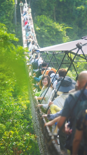 2月19日,中外游客在三亚亚龙湾热带天堂森林旅游区游玩打卡,漫步在雨林中赏花观景,登高望远。