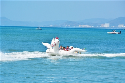 近日,游客在三亚湾乘坐充气船快乐逐浪,尽享春日温暖时光。