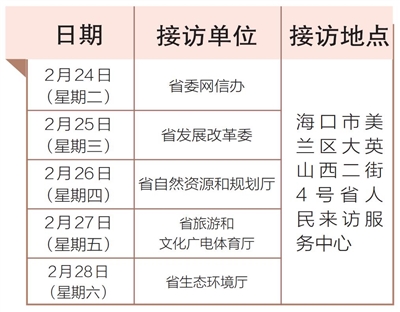 2月24日至2月28日,省委网信办、省发展改革委、省自然资源和规划厅、省旅游和文化广电体育厅、省生态环境厅相关负责人将在海口市美兰区大英山西二街4号省人民来访服务中心接访群众。