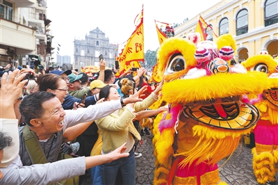 舞狮队伍在澳门大三巴牌坊前与市民互动。