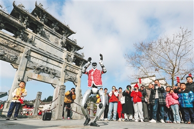 游客在安徽省黟县西递古村观看机器人表演。