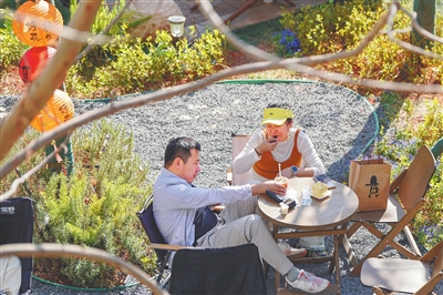 游客在云南昆明翠湖咖啡文化中心喝咖啡。