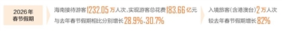 本报海口2月24日讯(海南日报全媒体记者刘晓惠 实习生周涵佳)2月24日,海南省旅游和文化广电体育厅发布数据,2026年春节假期海南接待游客1232.05万人次,实现游客总花费183.66亿元,与去年春节假期相比,分别增长28.9%、30.7%。以9天“加长版”黄金周叠加自贸港政策红利与热带海岛资源引力,全省旅游市场呈现人气旺、消费热、年味浓、国际化等特点。封关红利的持续释放,成为拉动海南春节文旅消费的核心动力,免税购物与入境旅游两大板块双双迎来爆发式增长,海南正加速迈向国际旅游消费中心。