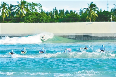 游客在位于万宁市的中旅逐浪度假区人工造浪池冲浪。