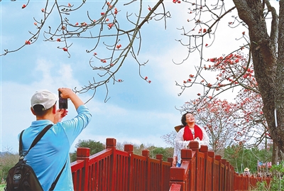 游客在昌江叉河镇排岸村赏花拍照。
