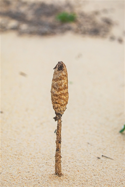 据了解,该物种标本首先被海口畓榃湿地研究所原项目主任袁浪兴在东方市一次滨海考察中发现。之后,海南昌江海尾国家湿地公园管理中心副主任薛美丽在昌江黎族自治县一处沙滩上拍鸟时,也偶遇了这种形态奇特的真菌。“当时很惊讶,这么烫的沙地上居然能长出这种蘑菇,而且数量不少。”薛美丽回忆,她发现此物种后拍了照片,随即发给曾念开教授。