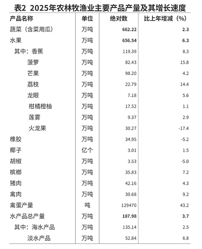 全年全省农林牧渔业总产值2631.86亿元,比上年增长4.7%。从内部行业看,种植业产值1378.22亿元,比上年增长4.0%。蔬菜(含菜用瓜)收获面积411.97万亩,较上年下降0.6%;产量662.22万吨,较上年增长2.3%。水果收获面积365.89万亩,比上年增长4.2%;产量656.54万吨,比上年增长6.3%。林业产值161.92亿元,比上年增长8.6%。橡胶产量34.95万吨,比上年下降5.2%。牧业产值322.16亿元,比上年增长5.2%。猪肉产量42.16万吨,比上年增长4.3%。禽肉产量30.68万吨,比上年增长9.2%。渔业产值625.52亿元,比上年增长4.6%。水产品总产量187.98万吨,比上年增长3.7%。农林牧渔专业及辅助性活动产值144.04亿元,比上年增长9.1%。农林牧渔业主要产品产量及其增长速度见表2。