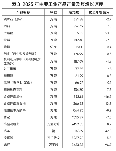 在主要行业增加值中,石油和天然气开采业增长48.7%,农副食品加工业增长18.8%,石油煤炭及其他燃料加工业增长24.7%,化学原料和化学制品制造业下降3.6%,医药制造业下降12.2%,电力热力的生产和供应业下降0.4%。主要工业产品产量及其增长速度见表3。