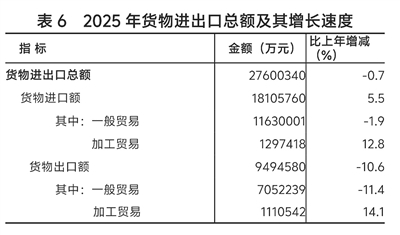 全年全省货物进出口总额2760.03亿元,比上年下降0.7%。其中,出口949.46亿元,下降10.6%;进口1810.58亿元,增长5.5%。货物进出口逆差861.12亿元。