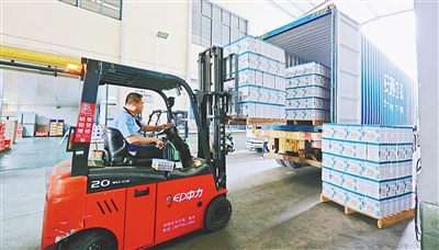 图为工作人员将椰奶产品装运上车,发往全国各地。