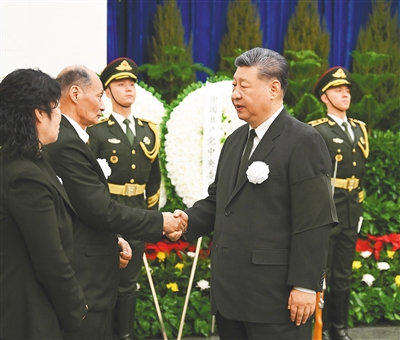 3月10日,宋平同志遗体在北京八宝山革命公墓火化。习近平、李强、赵乐际、王沪宁、蔡奇、丁薛祥、李希、韩正等前往八宝山送别,胡锦涛送花圈表示哀悼。这是习近平与宋平亲属握手,表示深切慰问。新华社记者 谢环驰 摄