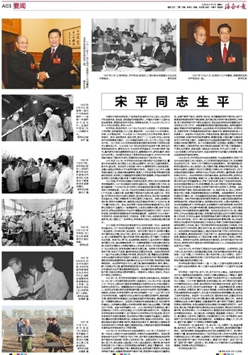 中国共产党的优秀党员,久经考验的忠诚的共产主义战士,杰出的无产阶级革命家、政治家,党和国家的卓越领导人,中国共产党第十三届中央政治局常委,原国务委员宋平同志,因病医治无效,于2026年3月4日15时36分在北京逝世,享年109岁。宋平同志,原名宋延平,1917年4月出生于山东莒县一个农民家庭。少年时期,他热爱祖国,为人正直,勤奋好学。1926年至1934年在青岛、济南、北平等地求学。1934年至1937年先后在北平大学农学院、清华大学读书。其间,他思想进步、追求光明,参加了一二·九运动,并加入进步组织中华民族解放先锋队。1936年春参加革命工作,1937年12月加入中国共产党。1937年至1938年受组织委派参加国民革命军第十四军政训班并从事政治工作。1938年至1947年先后任延安中央党校干事,延安马列学院组织科科长、教育处处长,中央党务研究室秘书,中央南方局学习秘书,重庆新华日报社编辑部资料室主任、编辑部秘书长,新华社重庆、南京总分社负责人,在此期间还担任了周恩来同志政治秘书,并作为中共代表团秘书参加了国共和平谈判,同国民党反动派进行了坚决的斗争。