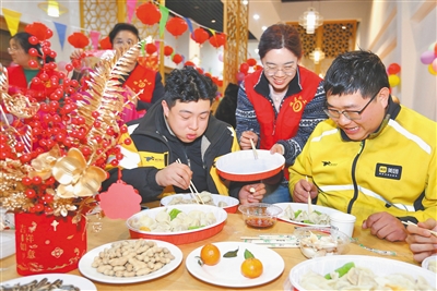 新就业群体人员在山东青岛即墨古城暖“新”驿站餐厅吃饺子。