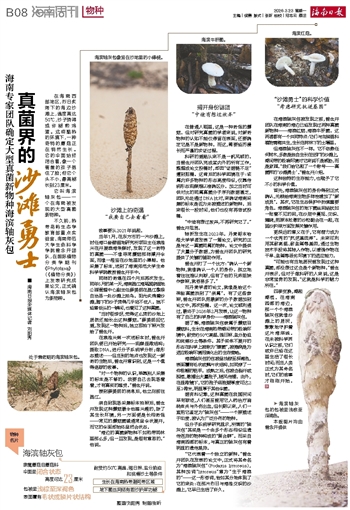 当年1月,在东方市的一片沙滩上,时任海口畓榃湿地研究所项目主任袁浪兴在开展滨海考察时,发现了这一奇特的真菌——不像寻常蘑菇那样撑开伞面,而像一根竖在沙地里的小棒槌。他采集了标本,送到了海南师范大学生命科学学院教授曾念开手中。