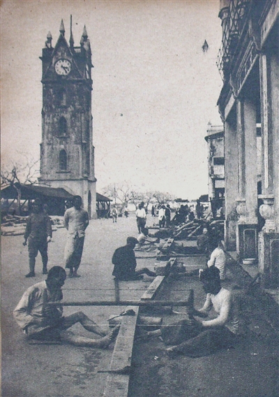 20世纪40年代,海口钟楼旁的木材加工场景。