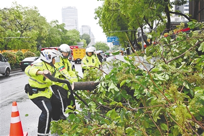 三月三十日,在广州市越秀区解放中路,交警清理倒伏树木。新华社发