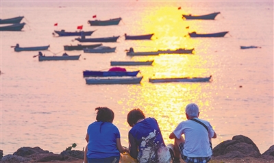 傍晚时分,夕阳将海面染成金红色,巨大的白色风车缓缓转动,与黑色火山岩海岸、蔚蓝大海构成一幅诗意画卷。