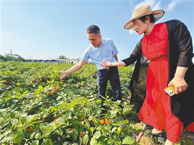 近日,在琼海市中原镇,专家学者走进黄灯笼辣椒种植基地查看长势情况。当日,黄灯笼辣椒全产业链模式现场观摩会在中原镇举行。来自科研机构、政府等单位代表及农户参与观摩,实地了解“党建引领、政府支持、科技赋能、农民参与、企业托底”产业模式的试点情况。