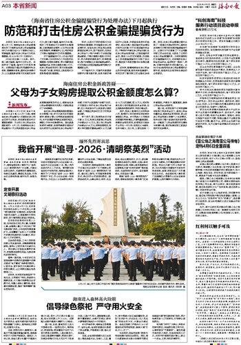 本报讯(海南日报全媒体记者李梦楠 通讯员黄臻 柏祥伟)清明前夕,海南省退役军人事务厅以“追寻·2026·清明祭英烈”为主题,开展纪念祭扫英烈、关爱帮扶烈属等活动,传承红色基因、赓续红色血脉,引导全社会崇尚英雄、缅怀先烈、争做先锋。海南具有丰富的红色历史资源,目前共有国家级烈士纪念设施5处、省级烈士纪念设施11处,载入英烈名录的烈士2万余名。清明期间我省依托中华英烈网、海南省退役军人事务厅门户网站“追寻·2026·清明祭英烈”专区、烈士纪念设施一张图等平台,为社会公众在线祭扫英烈、瞻仰烈士纪念设施、了解各地祭扫活动动态提供渠道。