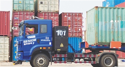 洋浦国际集装箱码头,一辆无人驾驶集装箱卡车正在作业。