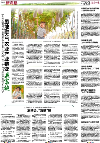 项目“穿针引线”,产业融合结硕果。“我们与全省18个市县达成垦地融合战略合作,搭机制、强合作、建项目,写好垦地融合尤其是产业融合的新篇章。”海垦集团相关负责人透露,“十四五”期间,该集团成立11家平台公司,在各市县累计投入118.44亿元,共建96个项目,带动就业超5000人。