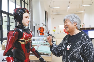 在深圳市养老护理院,一名老人与人形机器人“夏澜”互动。