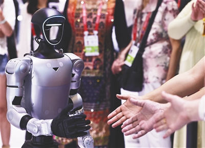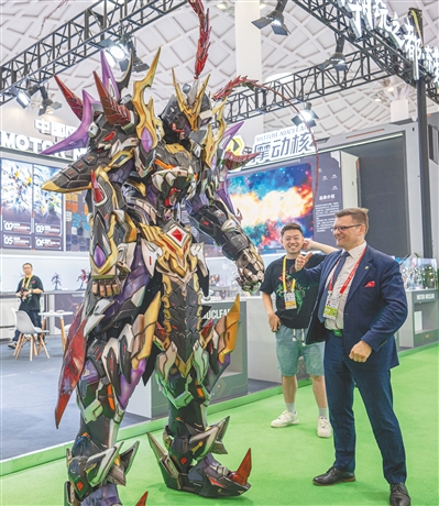 一名外国参观者在消博会现场与中国风机甲人偶互动。