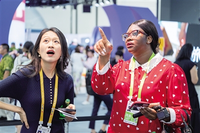 ② 第六届消博会现场,中外友人驻足交流。海南日报全媒体记者 袁琛 摄