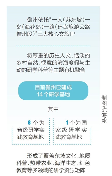 东坡文化是儋州亮丽的文化名片,也是儋州打造“研学儋洋”品牌的核心资源之一。儋州依托“一人(苏东坡)一岛(海花岛)一路(环岛旅游公路儋州段)”三大核心文旅IP,将厚重的历史人文、恬淡的乡村自然、惬意的滨海度假与生动的研学科普等主题有机融合。目前,儋州已建成14个研学基地,其中8个为省级研学实践教育基地,1个为国家级研学实践教育基地,形成了覆盖东坡文化、地质科普、热带农业、海洋生态、红色教育等多领域的研学资源矩阵。