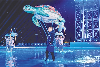 演练中最令人惊喜的环节,莫过于一场别开生面的海洋奇观。在“深海逐梦”篇章中,儒艮、鲸鲨、海龟、水母等形态各异的海洋生物从观众席间和两侧威压塔边缓缓“游”向主舞台。它们或在高空轻盈飞舞,或在座席区与观众亲密互动——亲亲脸颊、摸摸头,这些灵动的“海洋生物”打破了舞台与观众席的界限,让每一位观众仿佛沉浸于深海之中。开幕式另一总导演章东新表示:“我们希望通过这种沉浸式的互动设计,让每一位观众都成为演出的一部分。人与海洋生物零距离接触,传递的正是‘人与自然和谐共生’的理念。”