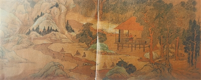 《兰亭修禊图》手卷,金笺纸本设色,纵24.2厘米,横60.1厘米,现藏于北京故宫博物院。此图根据东晋王羲之、谢安等人在浙江山阴(今浙江绍兴)的兰亭溪上修禊,作曲水流觞之会的故事而作。从画面看,图中层峦起伏,丛丛翠竹,参天古木,环境幽静。兰亭之畔,幽溪摆荡,曲水流觞。兰亭内有三文士,文思泉涌、谈诗论文。不远处的溪岸边,众士人盘膝而坐,或听或语,或沉思以观,情态各具,惟妙惟肖。细细品赏,但觉画面生动呈现王羲之等人在兰亭溪上举行修禊活动的场景,曲水流觞之佳景仿佛就在眼前。