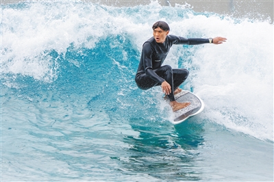 冲浪爱好者在中旅逐浪度假区人工造浪池享受冲浪乐趣。