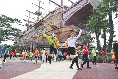 清晨6时许,天还没有全亮,在海南长影奇幻乐园出发点的广场上,就已经有不少市民在做热身运动。“平时上班久坐,今天天气凉爽,出来走走既锻炼身体又看了风景。”市民李爽一边压腿一边笑着说。