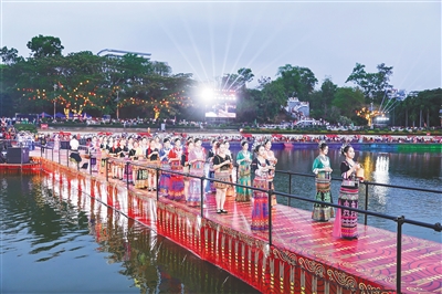 黎族苗族服饰、汉服、国际潮服的锦绣大秀更是惊艳全场——千年非遗纹样与现代时尚设计在此交汇,东方美学与世界潮流在此对话。非遗传承人、各族艺术家与来自世界各地的国际友人同台献艺,各民族舞乐和鸣,共同绘就了一幅美美与共的民族同心圆。