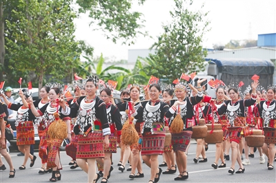 身着民族服饰的群众在琼中街头巡游。琼中融媒体中心供图