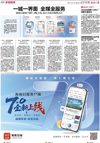 本报海口4月21日讯(海南日报全媒体记者刘乐蒙)4月21日,海南日报客户端7.0版焕新上线。此次新版本升级分别从界面重构、频道升维、服务聚合、活动引爆、积分闭环五大维度发力,致力于打造集主流舆论阵地、政务服务窗口、城市生活入口于一体的智媒新平台。此次升级有哪些亮点?让我们打开海南日报客户端,一探究竟。
