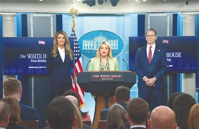 在美国首都华盛顿白宫,白宫新闻秘书莱维特(中)出席记者会。