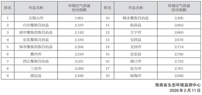 按照《环境空气质量标准》(GB3095-2012)及修改单、《环境空气质量评价技术规范(试行)》(HJ663-2013)和《城市环境空气质量排名技术规定》(环办监测〔2018〕19号)评价,2026年1月,全省环境空气质量优良天数比例为96.8%,其中优级天数比例为43.2%,良级天数比例为53.6%,轻度污染天数比例为3.2%,无中度及以上污染天。环境空气质量排名靠前的市县分别是五指山市、白沙黎族自治县和琼中黎族苗族自治县,排名靠后的市县分别是琼海市、东方市和海口市。2026年1月全省18个市县环境空气质量排名如右:
