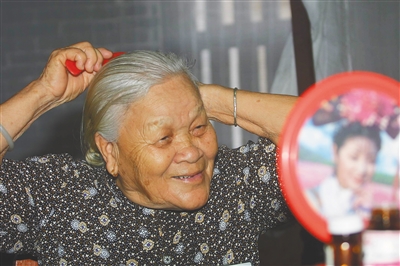 卢业香起床后对着镜子梳头。