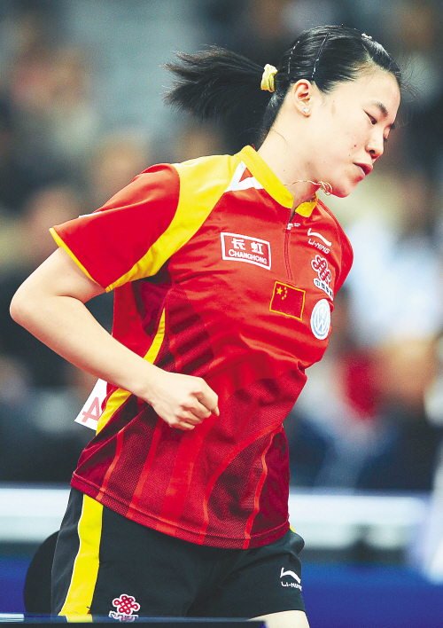 中国队当日的排兵布阵颇有些出人意料,铁打的主力张怡宁竟然被排在第三号位出场,第一单打是小将郭跃,老将王楠排在二号位。郭跃以3:1(12:10、11:6、7:11、11:7)胜姜华珺,王楠以3:0(11:2、11:9、11:4)胜帖雅娜;张怡宁以3:0(16:14、11:3、11:4)胜林菱。