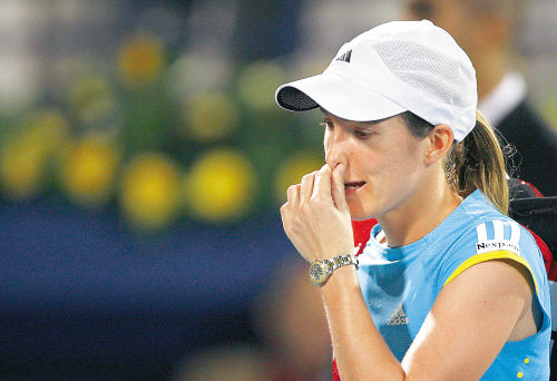 2月29日,在阿联酋迪拜网球公开赛中,头号种子海宁以0比2不敌意大利选手斯齐亚沃尼,无缘女单四强。图为海宁在失利后神情沮丧。 新华社发