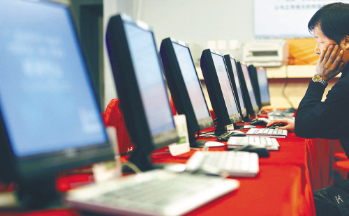 3月2日,一位记者在两会新闻中心使用电脑。两会期间,该中心还将免费提供实时新闻图片、电视广播相关节目信号、免费茶点和上网服务等。