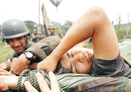 | 3月2日,在厄瓜多尔边境城市拉戈阿格里奥附近,厄瓜多尔士兵用担架运送受伤的哥伦比亚反政府武装“哥伦比亚革命武装力量”成员。 新华社/路透 |