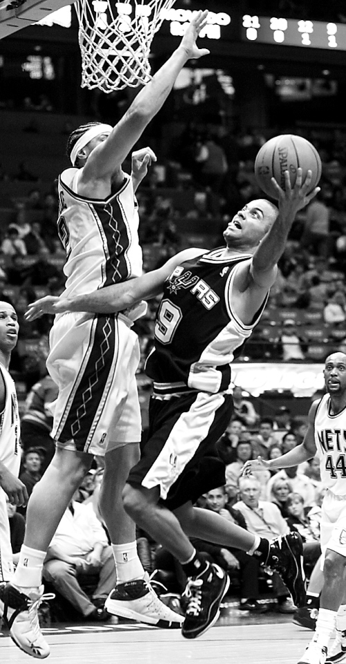 | 3月2日,在NBA常规赛中,马刺队客场以93比83战胜网队。图为马刺队球员帕克(右上)篮下强攻。 新华社发 |