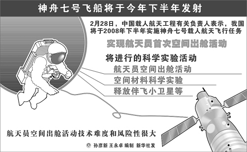 本报综合消息 据新华社报道,中国载人航天工程有关负责人28日在接受新华社记者采访时表示,我国将于今年下半年实施神舟七号载人航天飞行任务,实现航天员首次空间出舱活动。目前,各项准备工作正按计划进行。