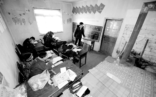 3月3日,仲威平在不足20平方米的教室内给全校四个年级和学前班的8名孩子集体上课。 在黑龙江省铁力市兰河村,有一所只有9个人的学校———兰河小学。唯一的老师仲威平留守这里,撑起了乡村教育的一片天空。 新华社记者 李勇 摄